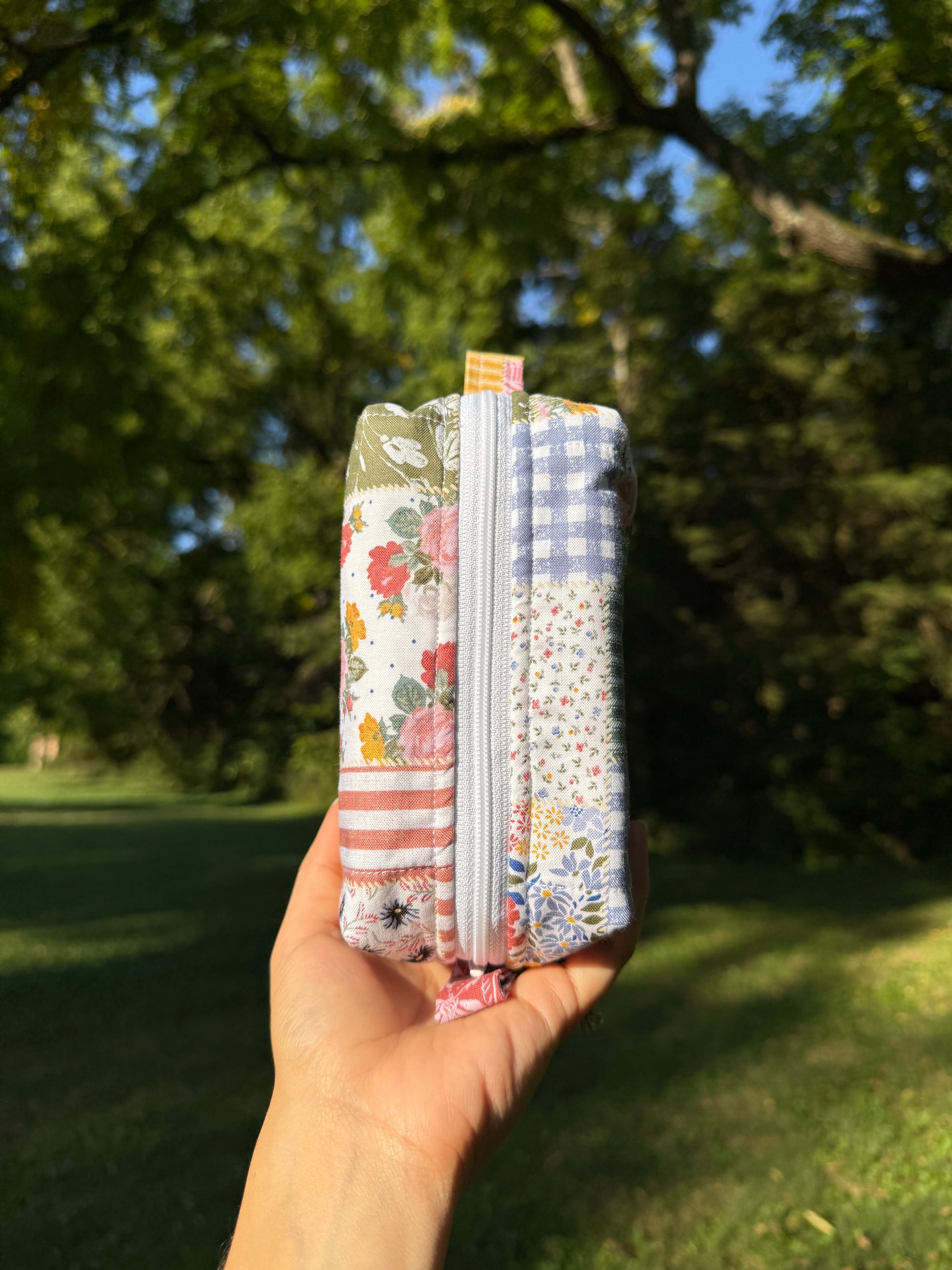 Please note: Each piece is handmade with love and intention. Variations are a natural part of the process—and part of what makes your mini bag uniquely yours. All of the Patchwork Garden Mini Makeup bag will look a little different from all the others since the fabric is different all throughout the bolt/roll, making this truly a one of a kind bag.
